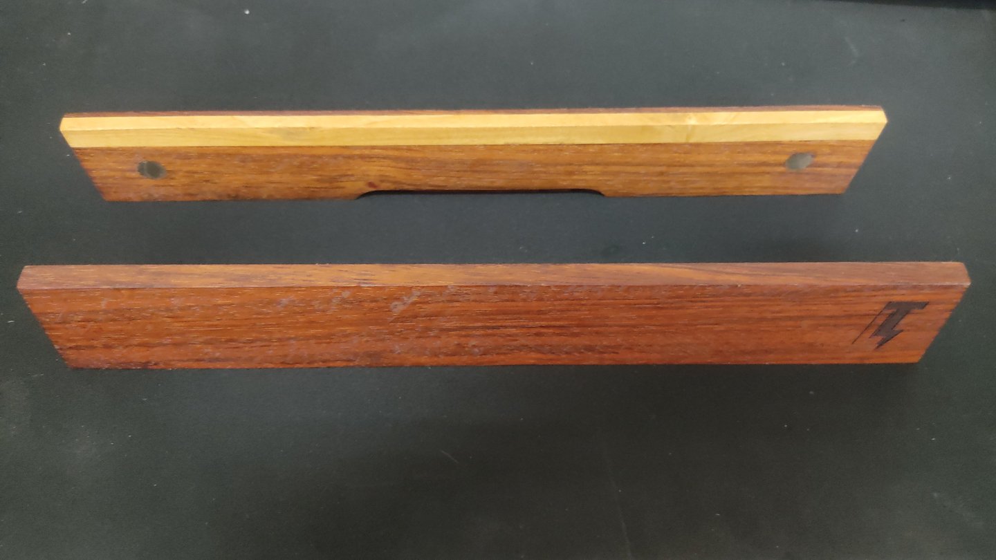 Um detalhe distintivo, e de grande utilidade, é a inclusão de uma borda contrastante em uma das réguas. Esta borda pode ser uma fina tira de madeira de cor diferente (como ébano ou nogueira em contraste com um bordo claro), ou até mesmo um entalhe sutil preenchido com um material escuro. O propósito dessa característica é amplificar a percepção visual de mínimas diferenças de altura, tornando a detecção de torções ainda mais fácil e intuitiva para o olho humano.