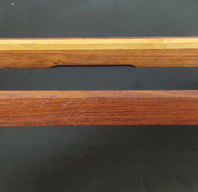 •Superfície Plana e Sem Torções: Se, ao observar, as bordas superiores das duas réguas formarem uma linha contínua e perfeitamente reta, sem qualquer interrupção, espaço ou desnível entre elas, isso indica que a superfície da madeira está plana e livre de torções. É o resultado desejado, significando que a peça está pronta para as próximas etapas.